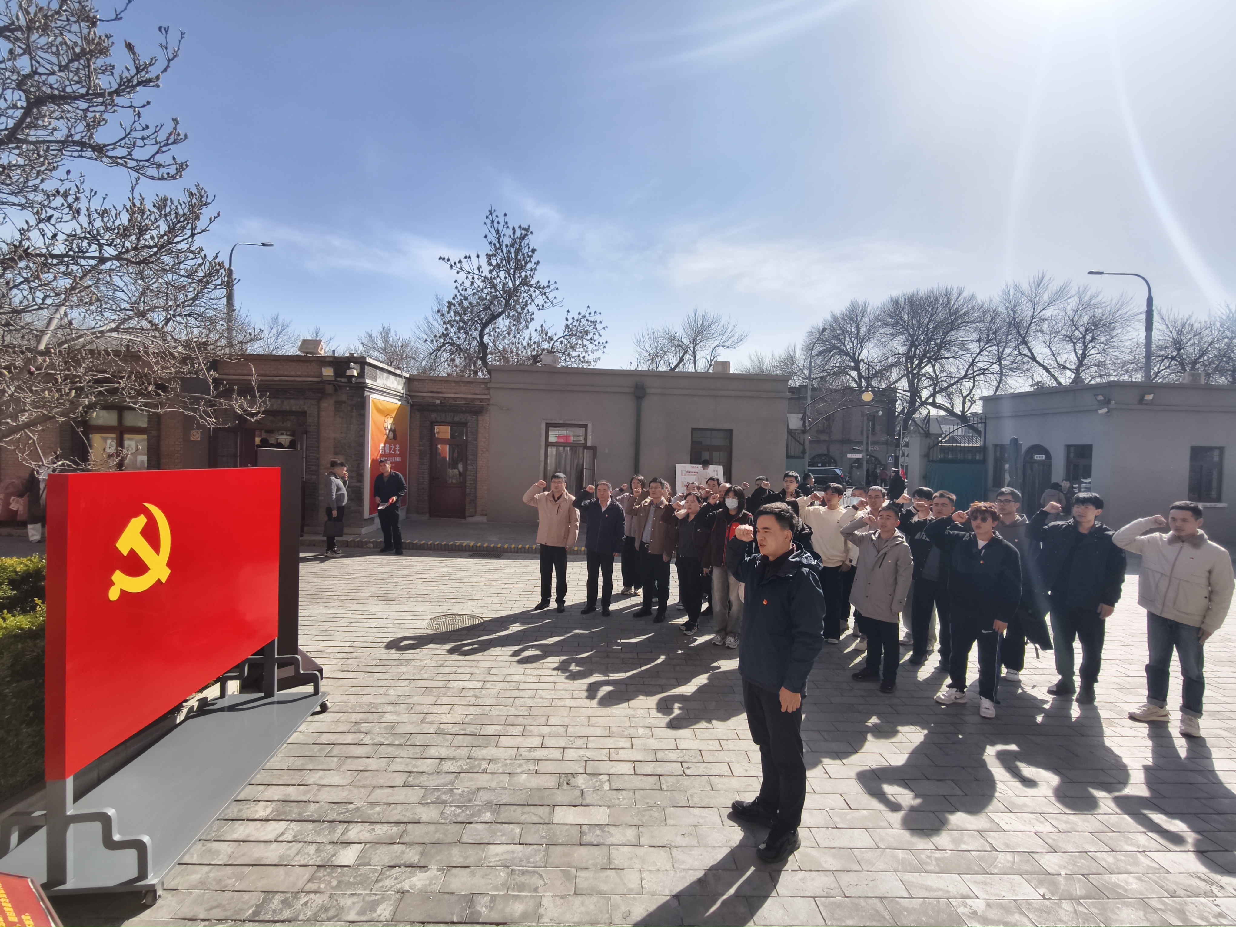 在承载厚重历史的纪念馆南门,全体党员面向鲜红党旗庄严宣誓。春日暖阳映照下,铮铮誓言与百年红楼的砖木肌理形成时空交响,“忠诚于党、科技报国”的初心使命在此刻愈显坚定。