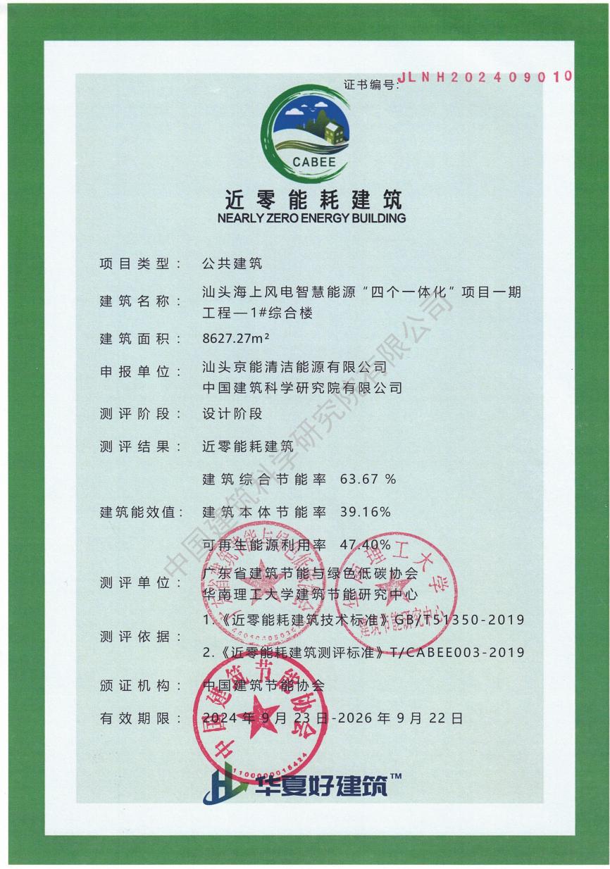 9月23日,由中国建研院设计并进行近零能耗技术咨询的汕头海上风电智慧能源“四个一体化”项目一期工程的综合楼顺利通过近零能耗建筑评审,取得近零能耗建筑(公共建筑)证书。