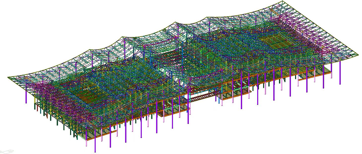 会议中心平面投影尺度209米*468米,地上三层,地下一层,局部设置夹层,建筑高度66.55米,采用钢框架-支撑体系,局部大跨采用平面桁架体系,二层局部存在转换结构,屋面采用平面桁架结构+轻屋面系统。办公楼地上六层,地下一层,建筑高度45.65米;酒店地上七层,地下一层,建筑高度45.65米。办公楼与酒店均采用钢框架结构,屋盖采用钢结构桁架+轻屋面系统。