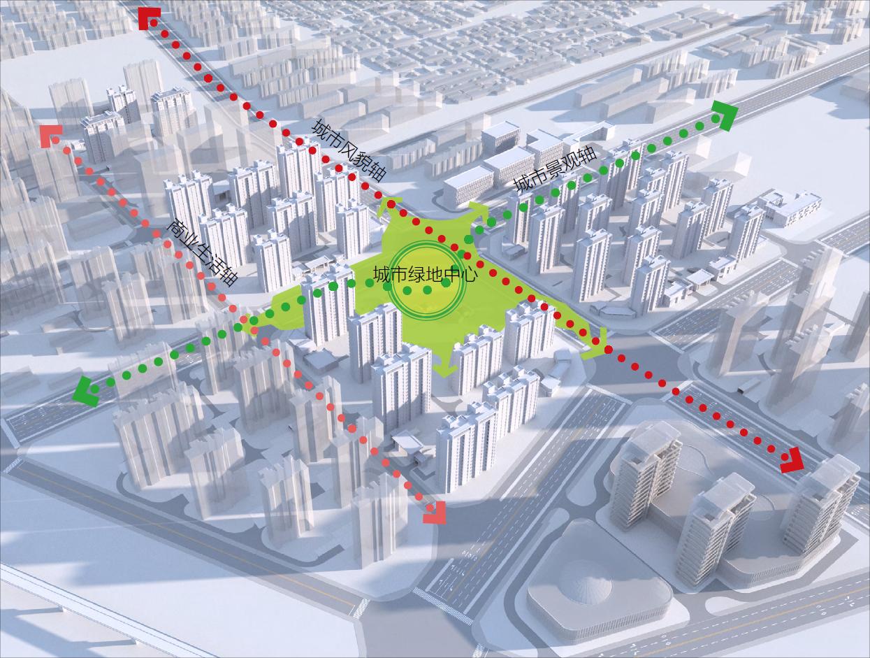 项目规划设计理念为“一心两轴”。其中,“一心”是结合区域文脉,打造以梁氏宅院所在城市绿地为中心的组团社区;“两轴”一是沿城市主路营造建筑错落有致的城市风貌轴、二是沿张营大街打造城市景观轴。通过“一心两轴”的打造,优化城市风貌建筑空间形象,构筑宜人的开放空间,创建完善的绿色交通系统以及布局完备的配套服务设施。