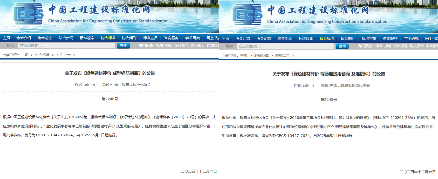 近日,由住房和城乡建设部科技与产业化发展中心、中国建研院会同有关单位编制的《绿色建材评价 钢筋连接用套筒及连接件》(T/CECS 10427-2024)、《绿色建材评价 成型钢筋制品》(T/CECS 10428-2024)(以下简称“两项标准”)由中国工程建设标准化协会正式批准发布,自2025年5月1日起施行。