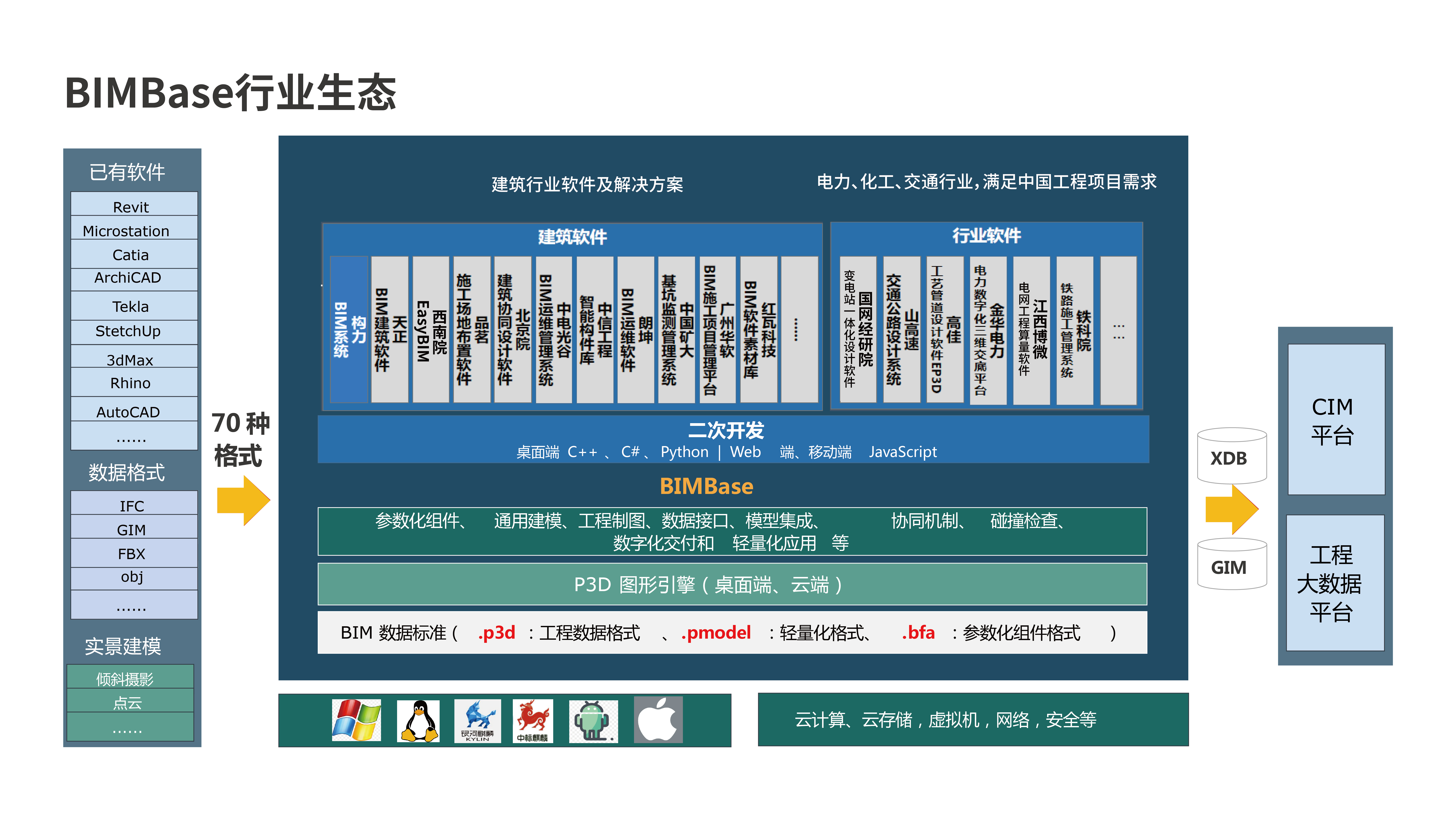 BIMBase平台为中国建造提供了数字化基础平台,可实现建筑、电力、交通、水利等行业的数字化建模、设计、交付、审查、归档。通过开放的二次开发接口,支持软件开发企业研发各种行业软件。目前,基于自主BIMBase平台研发的全国产BIM系列软件已陆续推向市场,为行业提供数字化解决方案。