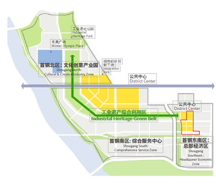 首钢园区规划分为3个片区,首钢北区依托现状工业遗产,作为文化创意园区,并已完成冬奥广场,遗址公园等相关开发,北京冬奥组委已入驻此片区;首钢南区规划为综合服务中心;项目基地位于首钢东南区,规划为总部经济区;首钢东南区为国际甲级写字楼,旨在打造世界级城市新地标。