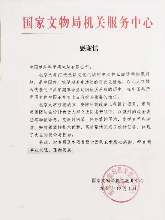 12月17日,建筑设计院收到国家文物局机关服务中心发来的感谢信,感谢建筑设计院北大红楼保护修缮项目团队以强烈的政治责任感和使命感,克服时间紧、任务重的困难,发挥公司在消防、安防领域的技术优势,高质量地完成了相关设计任务,展现了央企的使命与担当。