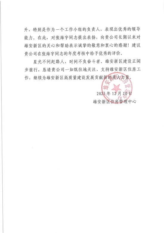 12月21日,公司建筑设计院收到雄安新区住房管理中心的感谢信。雄安新区住房管理中心在信中感谢设计院长期以来对雄安新区的关心和帮助,并对设计院选派至住房管理中心工作的同志进行表扬。