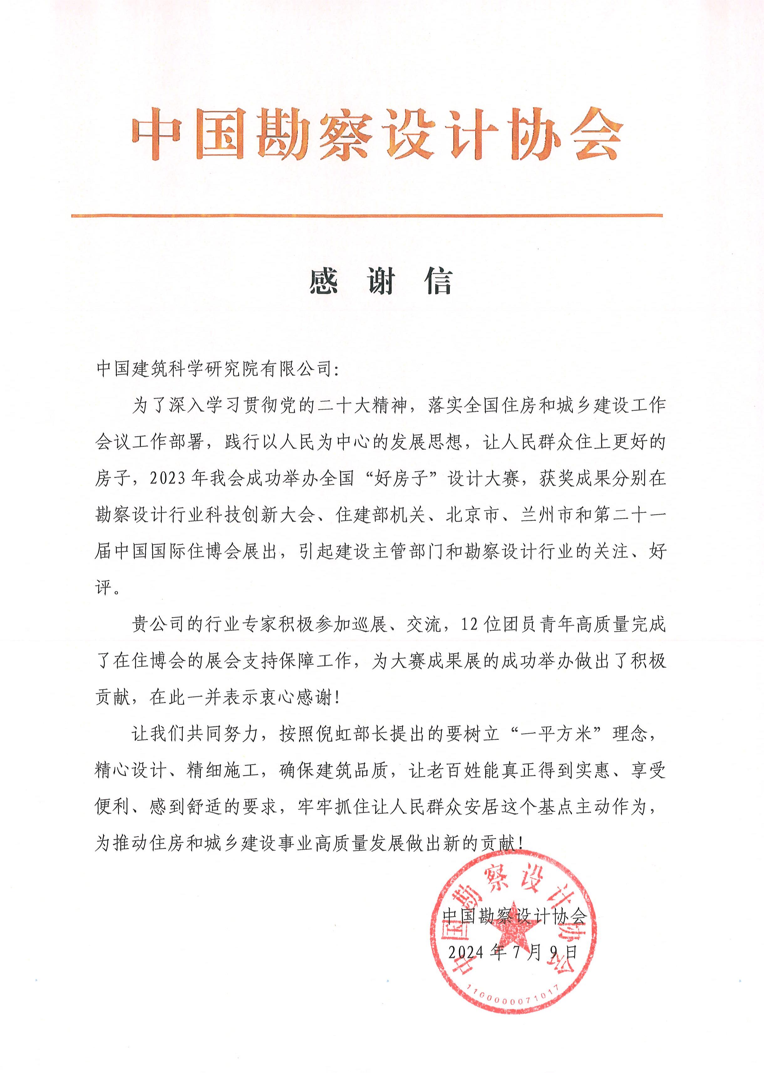 近日,中国建研院收到中国勘察设计协会(以下简称“中设协”)发来的感谢信,对中国建研院为中设协全国“好房子”设计大赛成果展成功举办作出的积极贡献表示衷心感谢。