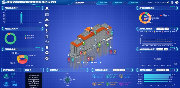 这一平台就好比“医生”为建筑穿上了一套复合监测设备,使其拥有了24小时“体检”与“听诊”服务,可以实时感知、监测、识别、评定、预警和分析处理建筑的各项健康指标。无论是建筑的结构、幕墙,还是环境及能耗等,都可以在平台上实时一体化监测与关联性监测。