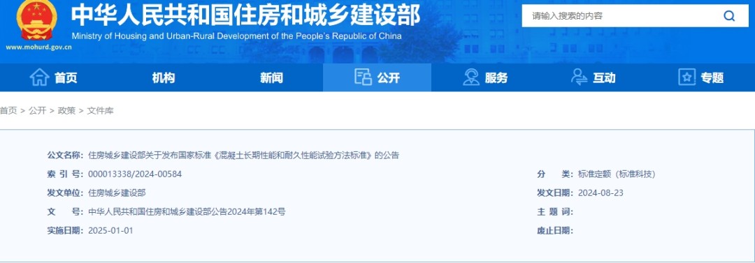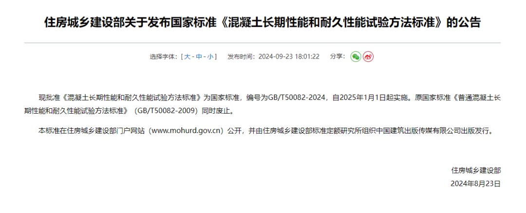 9月23日,住房城乡建设部发布《混凝土长期性能和耐久性能试验方法标准》(GB/T50082-2024),自2025年1月1日起实施。该标准由中国建研院主编,中建研科技承担主要编制工作,其发布标志着我国三大混凝土性能试验方法标准的新一轮更新完善圆满完成,并全部进入实施阶段。