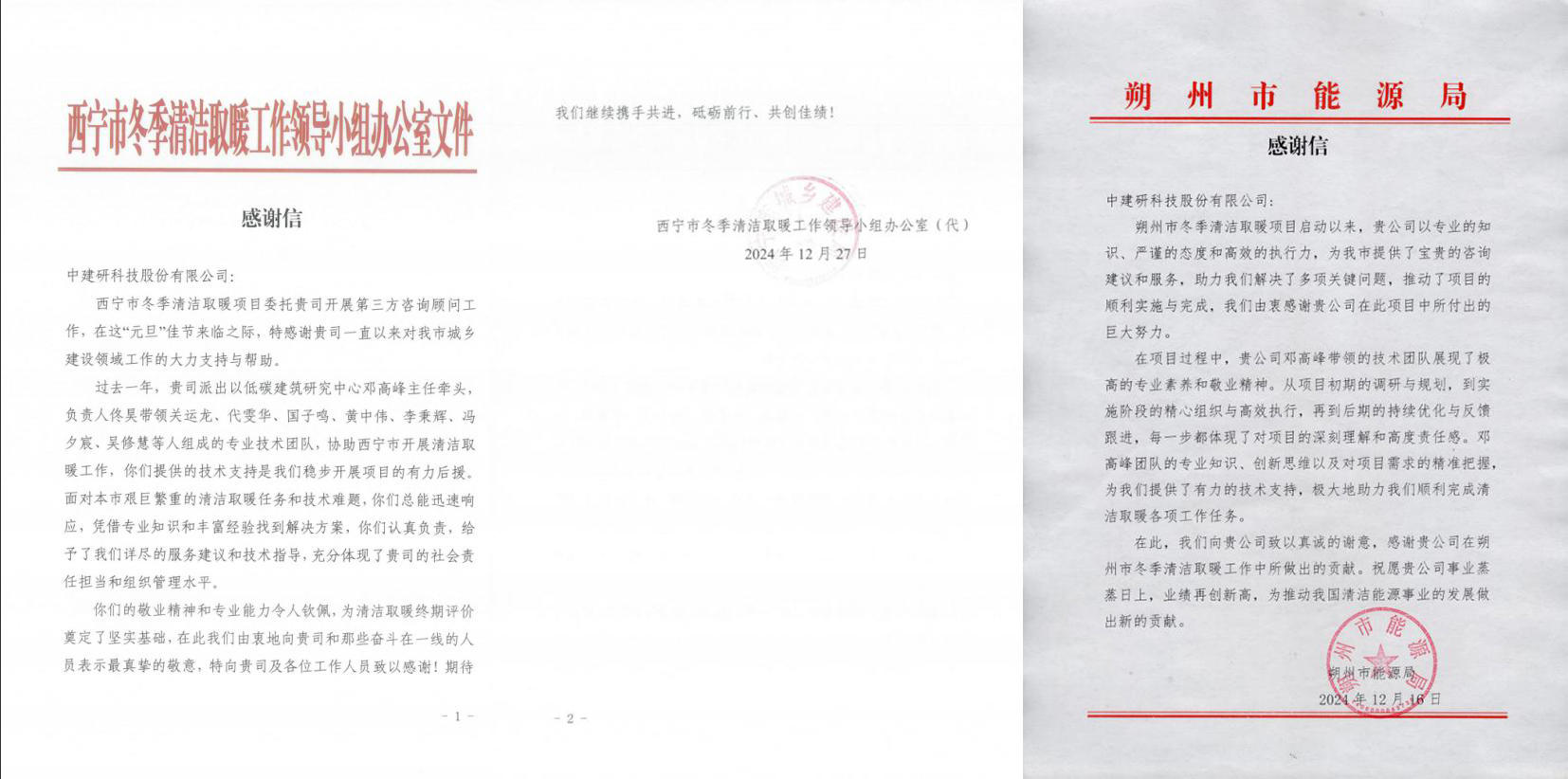 近日,中国建研院中建研科技收到西宁市冬季清洁取暖工作领导小组和朔州市能源局的感谢信,信中对中建研科技在冬季清洁取暖工作中的突出贡献表示高度肯定和诚挚感谢。