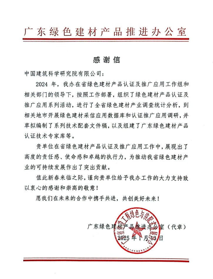 近日,广东绿色建材产品推进办公室发来感谢信,对中国建研院在广东省绿色建材产品认证及推广应用工作中给予的大力支持表示衷心感谢。