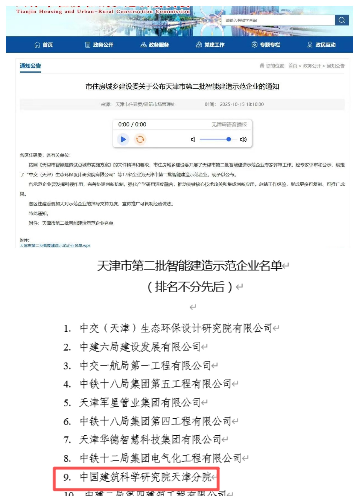 近日,天津市住房和城乡建设委员会正式公布天津市第二批智能建造示范企业名单,天津分院凭借在智能建造领域的深厚技术积淀、丰硕实践成果与系统化发展路径,成功入选,荣获“天津市智能建造示范企业”称号。