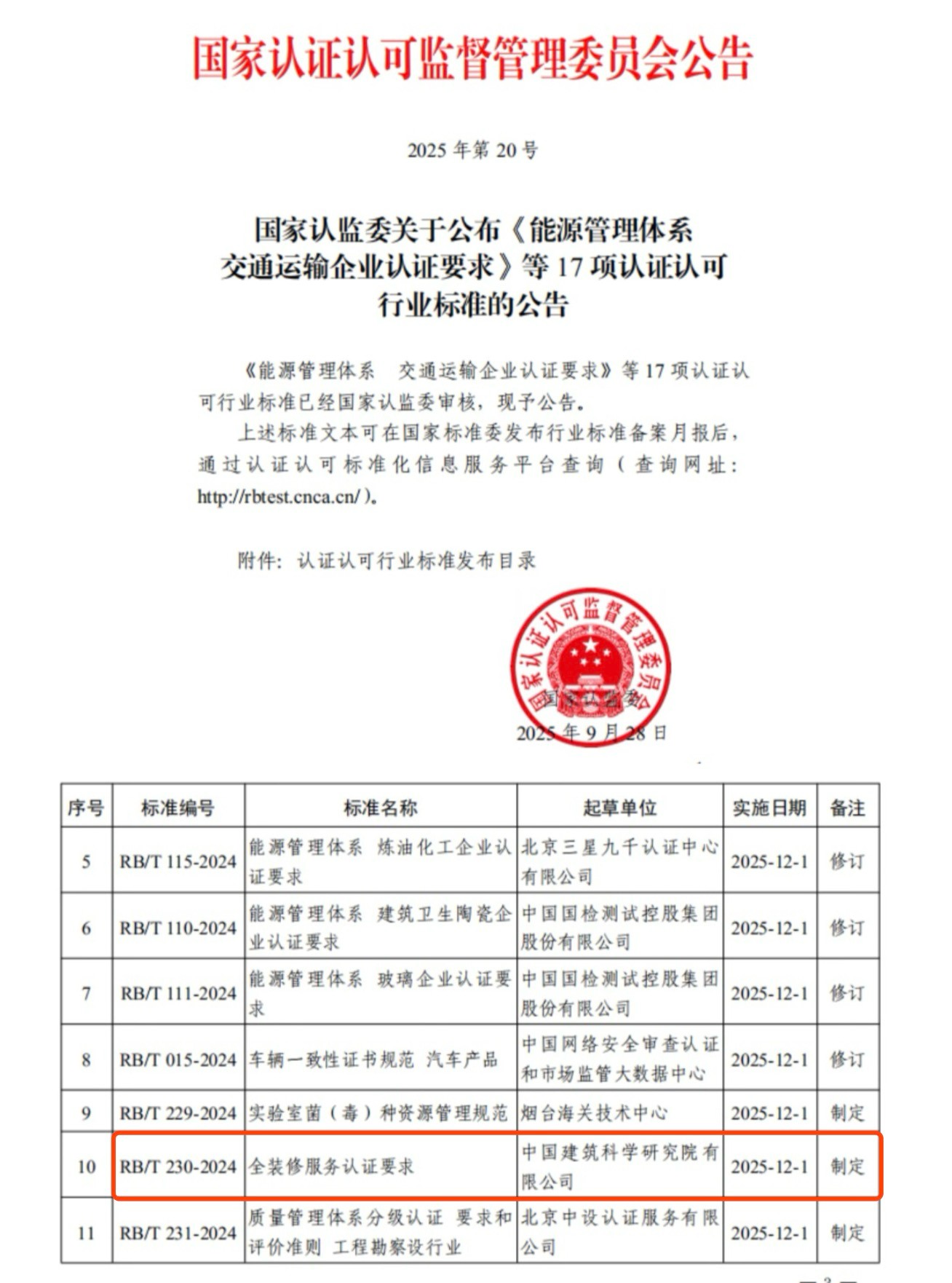 国家认证认可监督管理委员会于近期发布2025年第20号公告,公布了17项认证认可行业标准,其中包括由中国建研院起草制定的《全装修服务认证要求》。该标准编号为RB/T 230-2024,实施日期为2025年12月1日,标准文本可通过认证认可标准化信息服务平台查询(http://rbtest.cnca.cn)。
