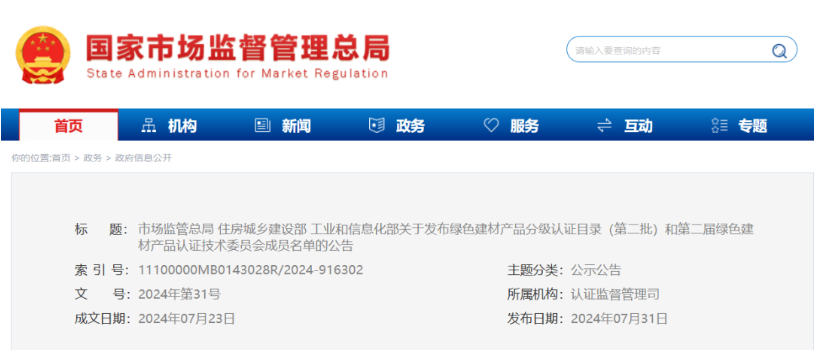 绿色建材产品认证,是由市场监管总局、住房城乡建设部、工信部联合推行的分级认证制度,旨在健全绿色建材市场体系,增加绿色建材产品供给,提升绿色建材产品质量,促进建材工业和建筑业转型升级。纳入首批认证范围的包括围护结构及混凝土、门窗幕墙及装饰装修、防水密封及建筑涂料、给排水及水处理设备、暖通空调及太阳能利用与照明、其他设备等6大类建材产品。