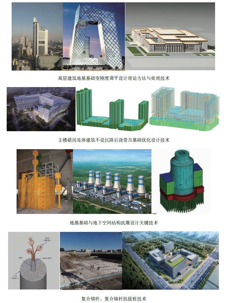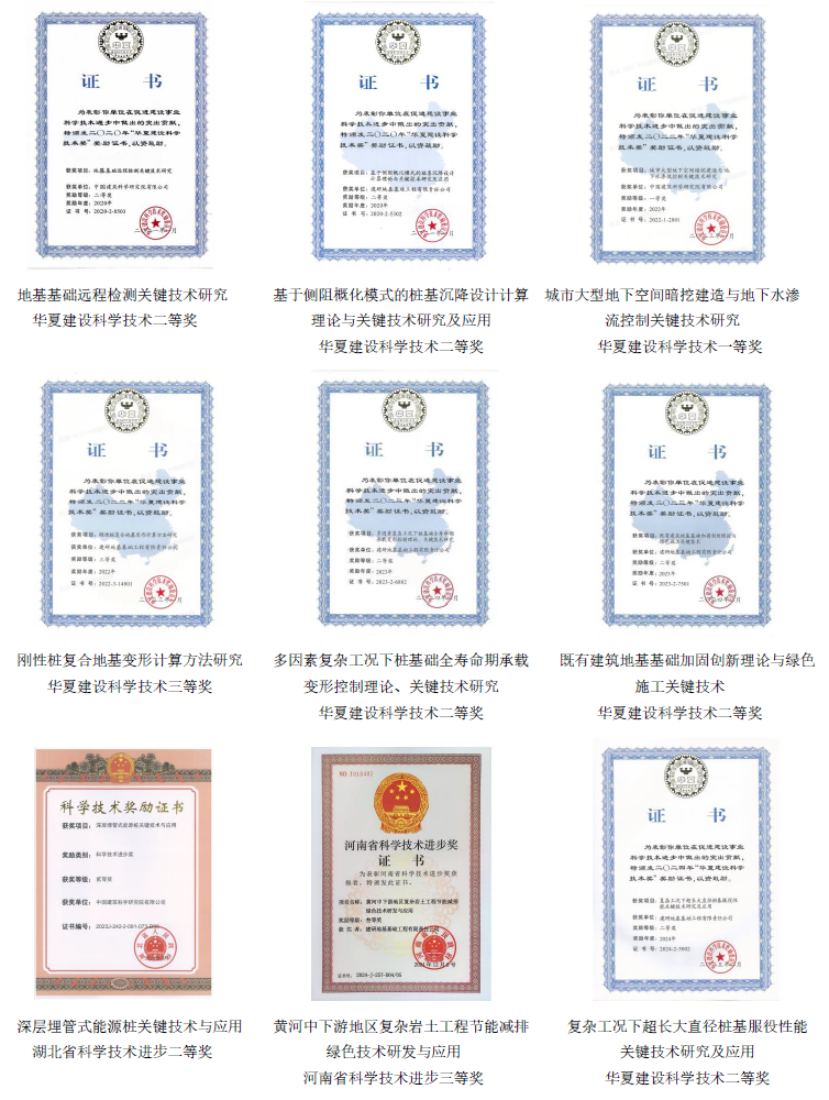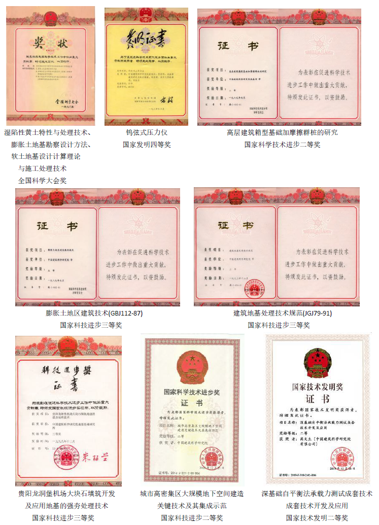 中国建研院地基所成立近七十年来,在土的工程性质及其测试技术、地基处理、桩基础、高层建筑箱筏基础、深基坑支护等方面取得了系统的高水平研究成果。先后荣获国家科技进步奖5项、全国科学大会奖5项、国家发明奖2项、中国专利优秀奖2项、全国工程建设标准定额优秀标准奖2项、省部级科技进步奖60项、中国工程建设标准化协会标准科技创新奖5项;主持编制标准规范56部;授权专利124项(有效期内),软件著作权21项;国家级工法2项,北京市工法1项。