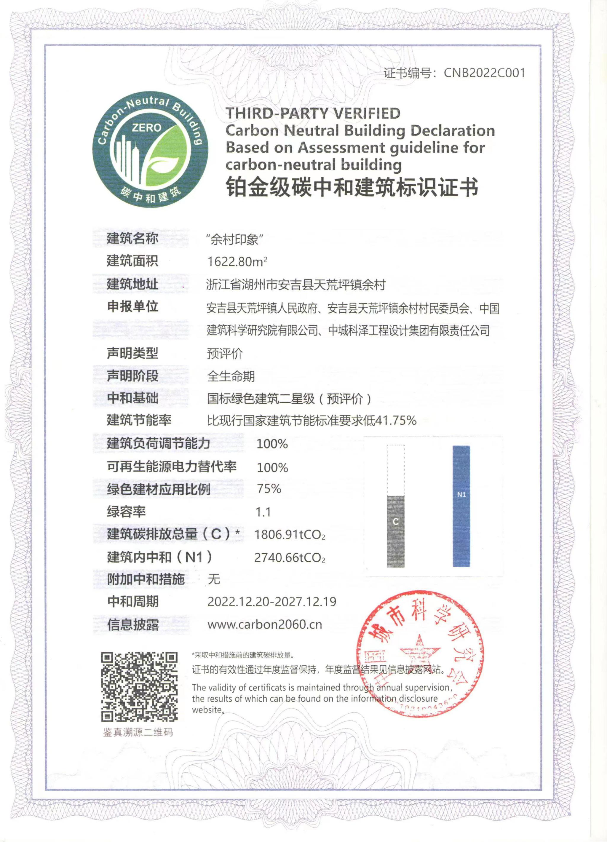 为推动经济社会绿色化、低碳化,作为“两山”理念的发源地,浙江省湖州市安吉余村率先围绕自然生态资源资产化、资本化、产品化、品牌化开展生态实践,大力推进环境整治,加快产业融合,取得了显著成效。近年来,中国建研院发挥技术优势,以建筑全生命周期碳中和为目标,在余村打造了全国第一个铂金级乡村碳中和建筑,为乡村建筑实现碳中和提供了解决方案。