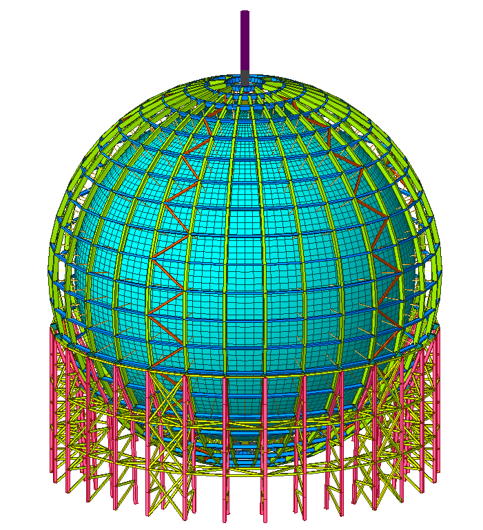 接到中心探测器结构方案咨询任务后,团队首要工作是深度研判探测器的技术需求,最终通过多方案比选,确定不锈钢单层网壳+有机玻璃球复合结构体系——网壳承担承重功能,有机玻璃球罐用于储存液体闪烁体。团队反复细化网壳分格尺寸、有机玻璃球壁厚、支撑构件参数,完成方案图纸绘制与报告编制;同时开展模拟计算进行多维度验证,形成的计算报告为方案可行性提供了科学依据。