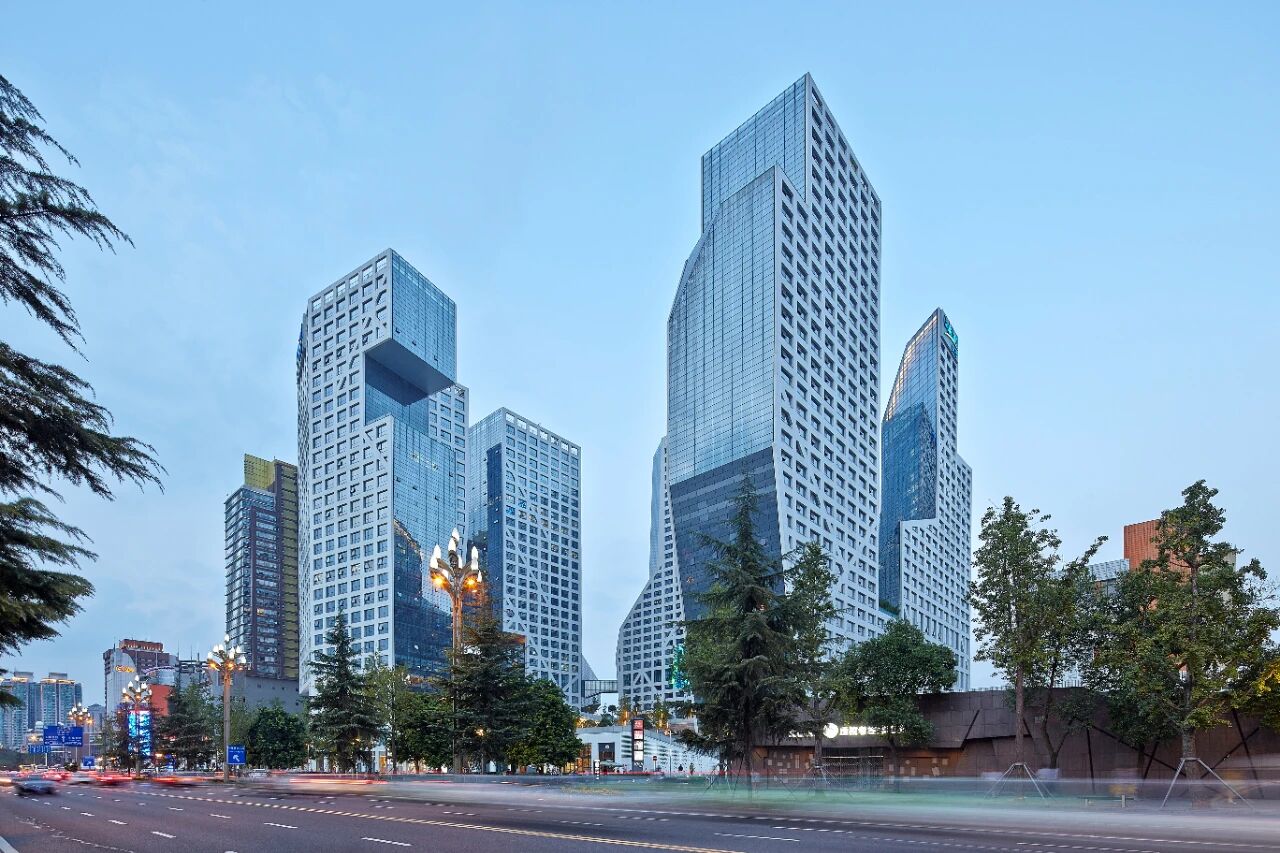 成都来福士广场位于成都市人民南路,由五栋超高层建筑坐落在连贯而高低错落的裙房上组成,是集商业、写字楼、酒店和服务式公寓于一体的大型城市综合体。项目由中国建研院建筑设计院和斯蒂文·霍尔建筑师事务所联合设计完成,设计强调建筑在各个维度与城市充分接触交融,形成建筑的“多孔性”特征。通过日照分析反推出建筑造型,从而形成了“巴山蜀地”的场所氛围。建筑富于变化的形式和空间,以及富于亲和力的界面,使之成为成都市的地标之一。项目首次大面积采用了白色清水混凝土外墙,并系统性采用了绿色建筑技术,获LEED铂金奖认证。中国建研院中建研科技承担项目结构顾问、部分施工图设计和振动台试验工作,对项目进行风洞试验和风环境数值模拟、动力弹塑性分析。