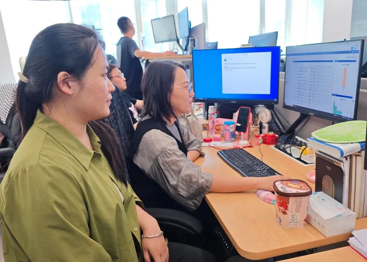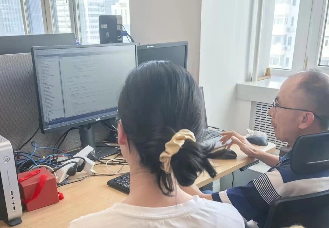构力科技Plant软件研发部企业导师杨华(右)和构力科技、哈尔滨工业大学联合培养的硕士研究生杨洺共同分析待解决的软件BUG问题。