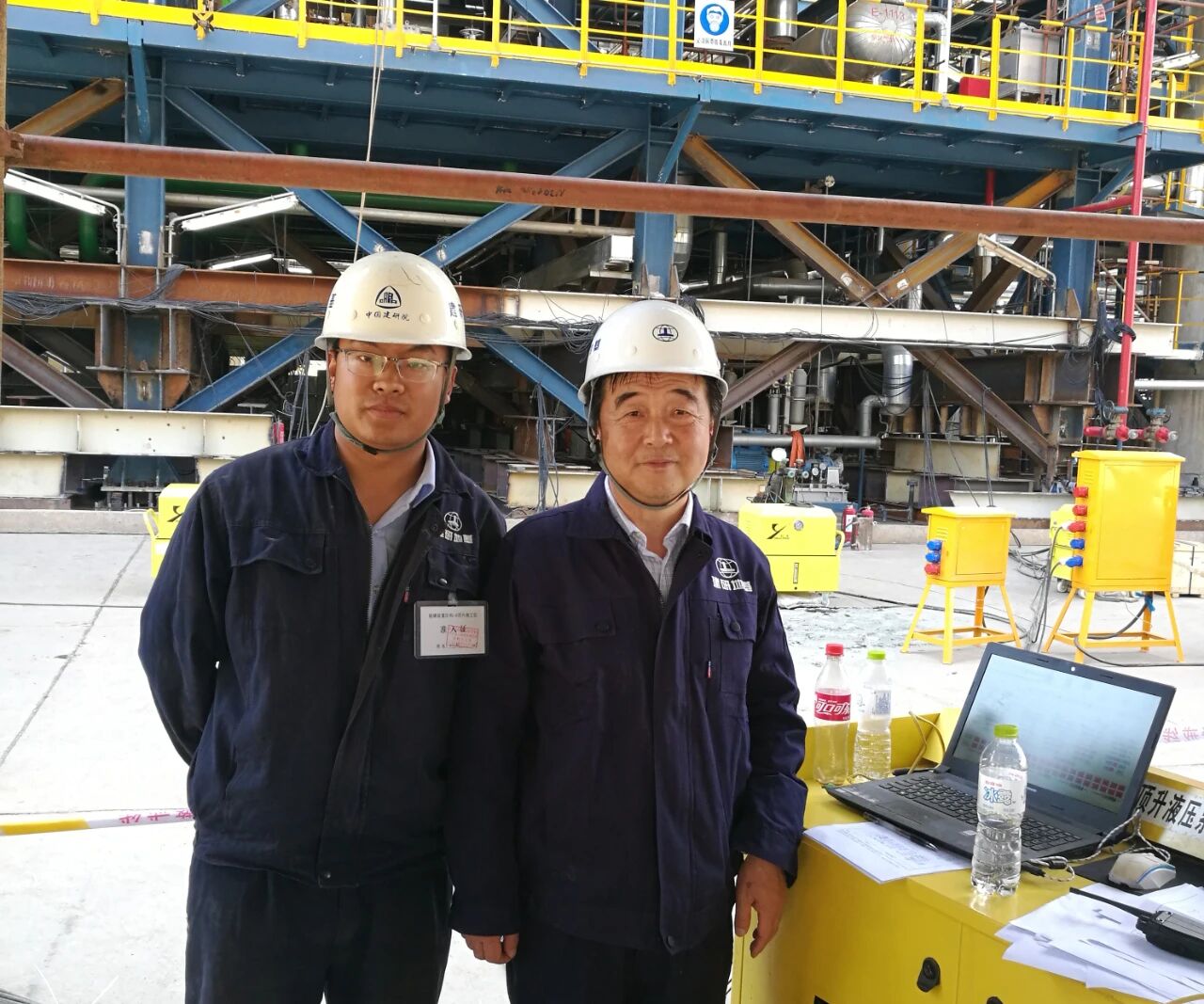 2017年导师杨斌(右)到中石油云南石化构六顶升纠偏加固项目检查指导工作。博士研究生刘丰敏任该项目顶升小组组长,该项目为建研地基首次采用PLC同步顶升控制系统进行钢结构纠偏,取得圆满成功。