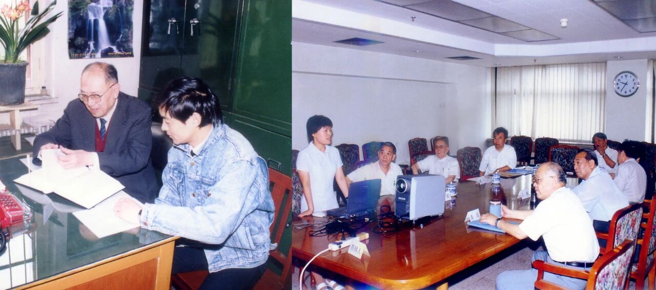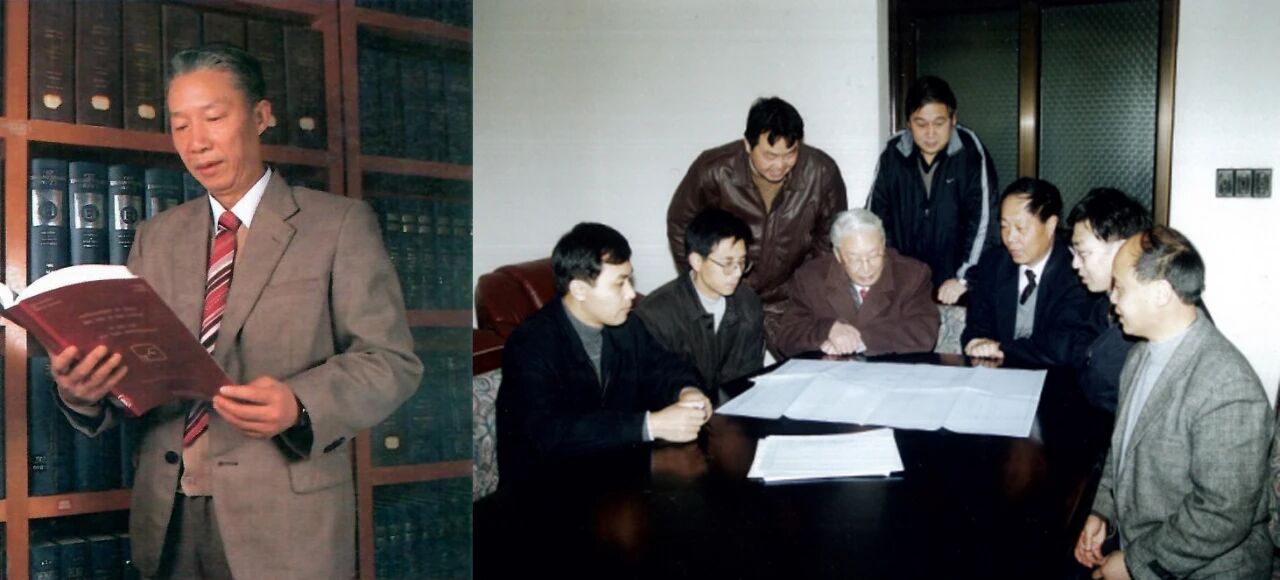 左图为1993年中国建研院建筑结构工程专家、中国工程设计大师何广乾在指导博士研究生论文。右图为1999年何广乾大师(左三)参加博士学位论文答辩会。何广乾大师十分重视高技术人才的培养,对学生不但给予学业上的指导,更多的是品格上的提升,培养了一批行业栋梁。