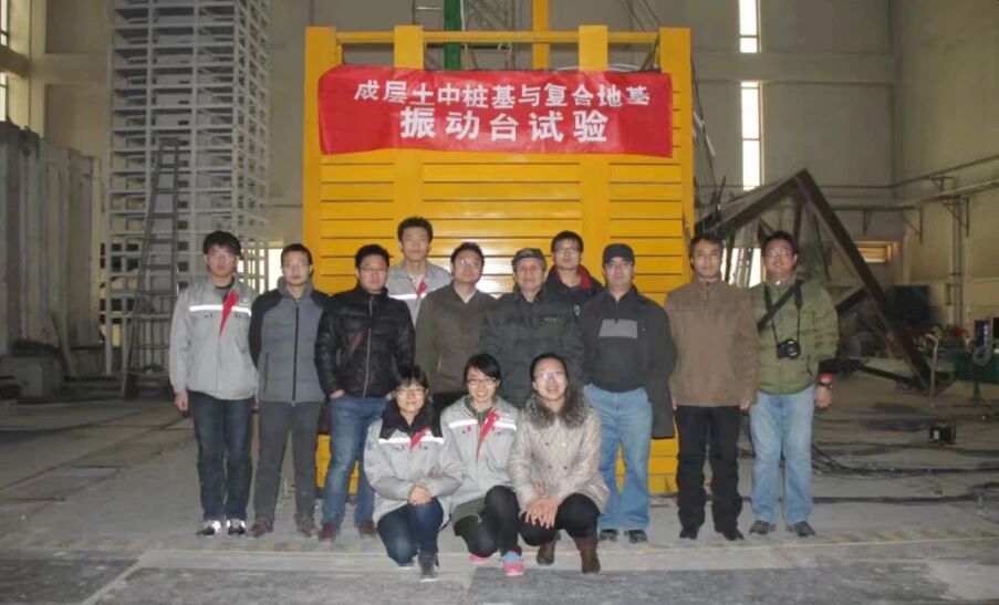 2012年,80岁高龄的导师刘金砺(二排右四)与他的学生高文生(二排右三)、分管科研工作的宫剑飞(二排右二)在中国建研院通州实验室共同指导高文生的硕士研究生倪克闯(三排右一)进行“成层土中桩基与复合地基振动台试验”。刘金砺老师从课题研究的技术路线到模型箱的加工制作与试验数据分析,每个环节都给予了细心的关注和指导。
