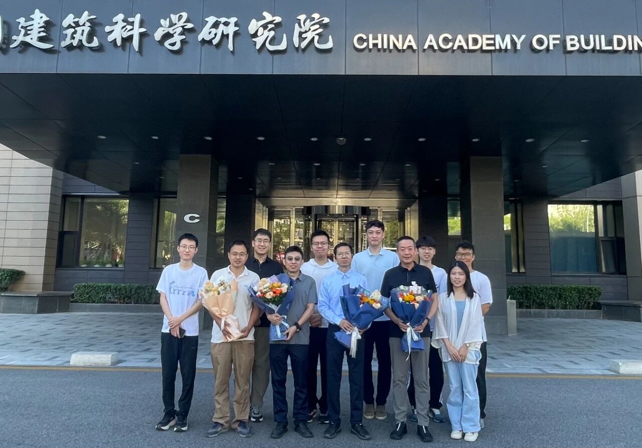 2025年在中国建研院主楼前,学生们为导师冷发光(一排右三)、王晶(一排左三)、黄靖(一排右二)和王永海(一排左二)献上鲜花,表达敬意与感恩。师生们相聚在此合影,既展现了学生对老师们的诚挚祝福,也定格了师生间的美好互动与深厚情谊。