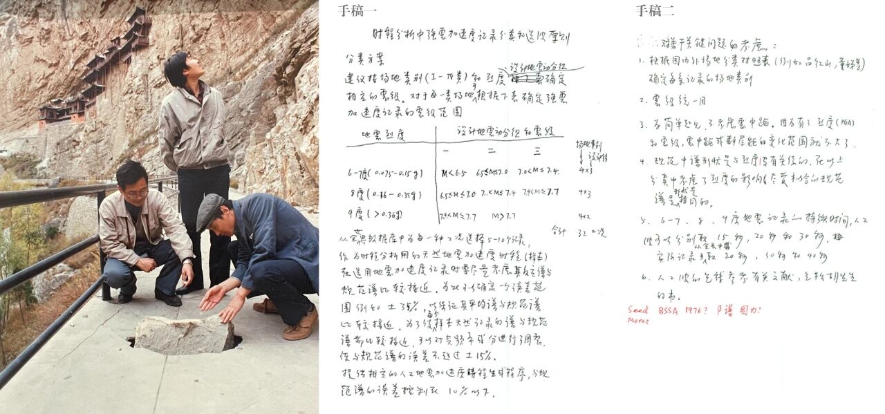 左图为1989年中国建研院建筑抗震专家、中国科学院院士周锡元(左一)在大同阳高地震调研一线。右图为周锡元院士与学生们交流关于天然波选择的想法(手稿)。周锡元院士以严谨的治学态度和深切的为民情怀,为学生们树立起一座精神的灯塔。他俯身细致核查地震情况,笔记本上密密麻麻的字迹,不仅是数据的记录,更是责任与智慧的沉淀。