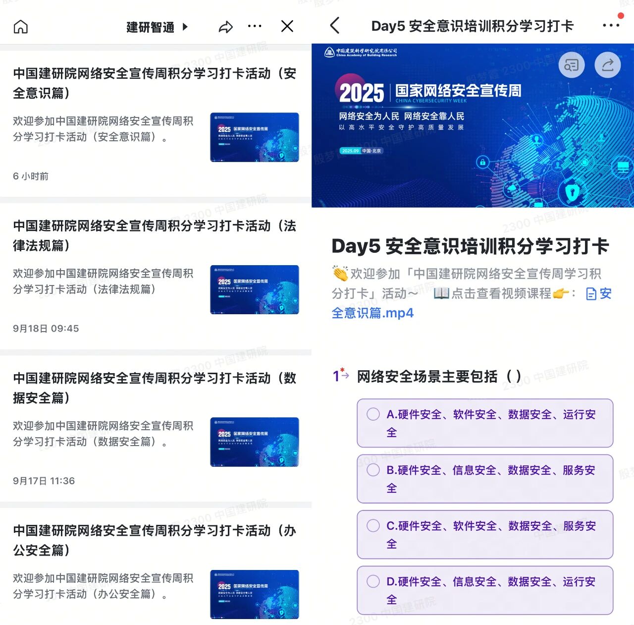 中国建研院通过“建研智通”平台每日推送主题学习视频,并开展系列线上答题活动,内容覆盖人工智能安全、数据防护、办公环境安全、安全意识培训及安全生态共建等多个维度,有效激发了全体职工学习网络安全知识的主动性和积极性。