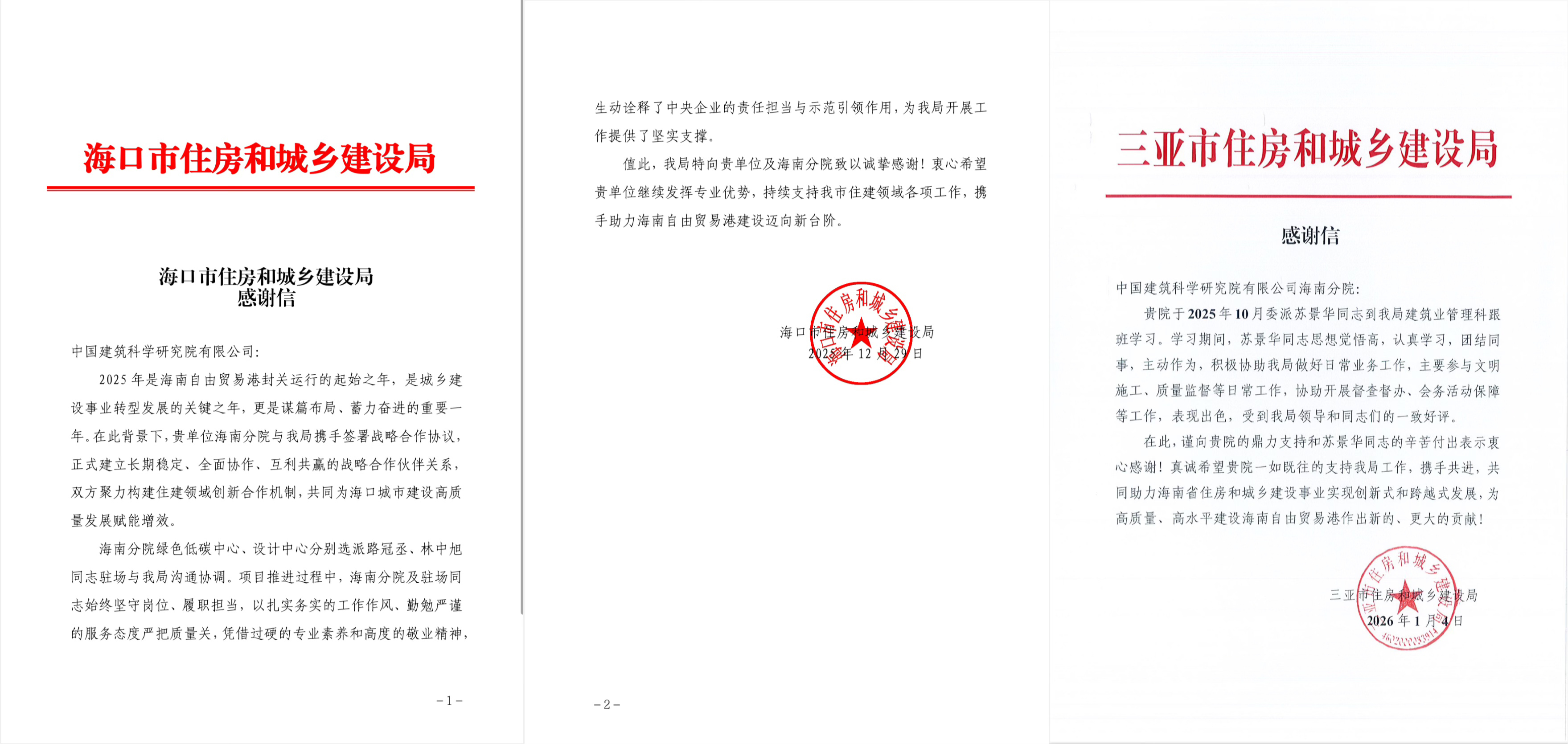 岁末年初,中国建研院热带院接连收到来自海口市住房和城乡建设局、三亚市住房和城乡建设局的两封感谢信。信中对热带院在海南自由贸易港建设关键阶段,于城乡建设战略合作、业务协作支持等领域展现的专业担当、务实作风与突出成效给予高度赞誉,为双方持续深化合作、共促海南住建事业高质量发展凝聚了坚实共识与强劲合力。