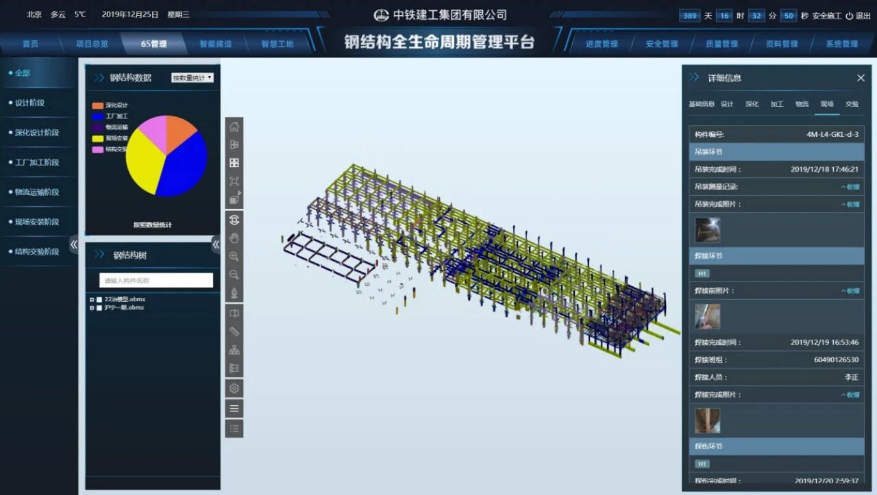 北京丰台站作为国内首座采用普速、高速双层车场设计的特大型铁路枢纽,其建设中深度应用了国产BIM技术,提高了工程质量、降低了建造成本。为有效推进钢结构BIM全生命周期智能建造,实现“精品工程、智能丰台”的目标,构力科技与有关单位开展合作研发BIM+GIS钢结构全生命周期管理平台,其将BIM、GIS、物联网、信息化、大数据等技术融入钢结构全生命周期管理,实现构件生产、运输、吊装全流程数字化管控,强化项目全生命周期信息的互联互通。