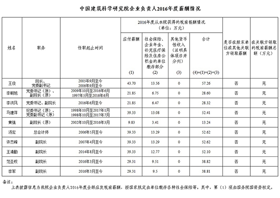 【企业负责人薪酬】中国建筑科学研究院企业负责人2016年度薪酬情况