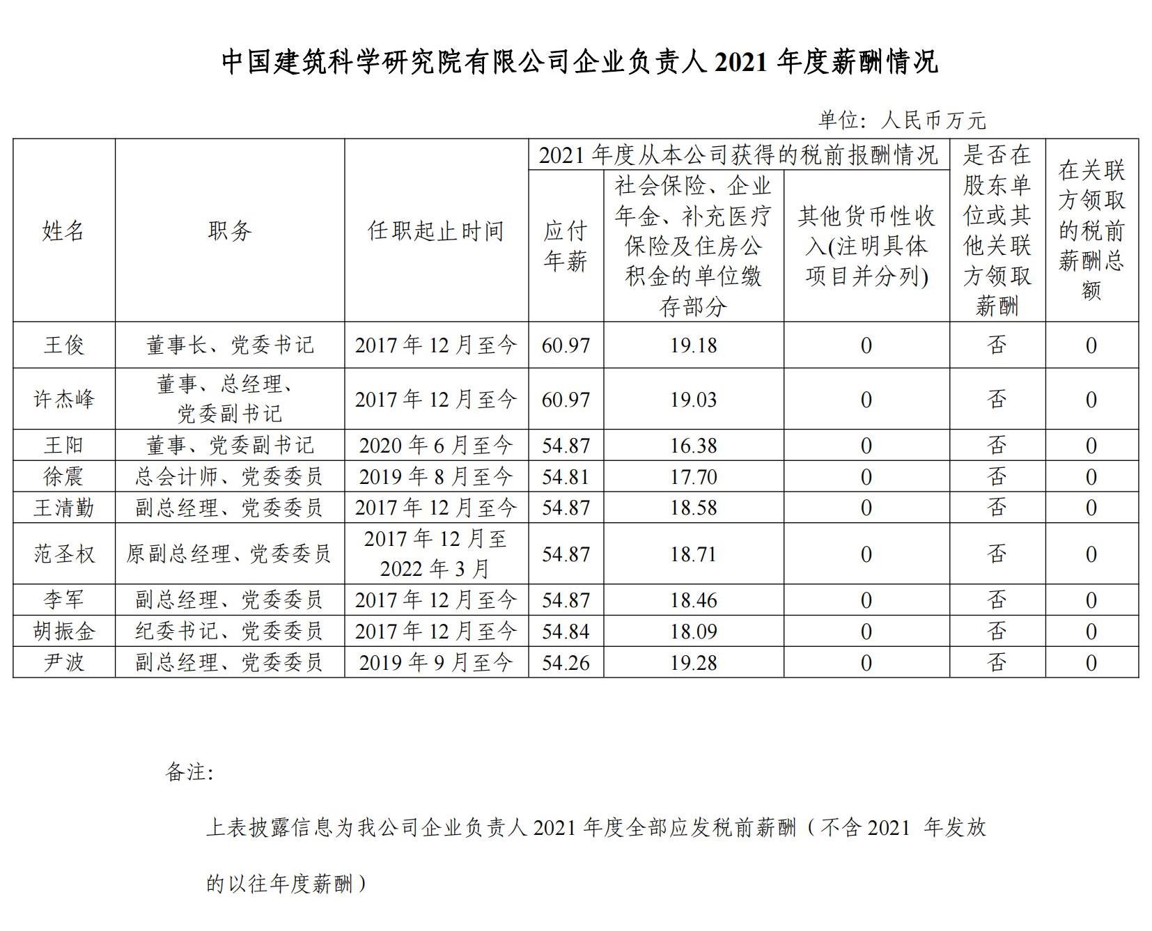 【企业负责人薪酬】中国建筑科学研究院有限公司企业负责人2021年度薪酬情况