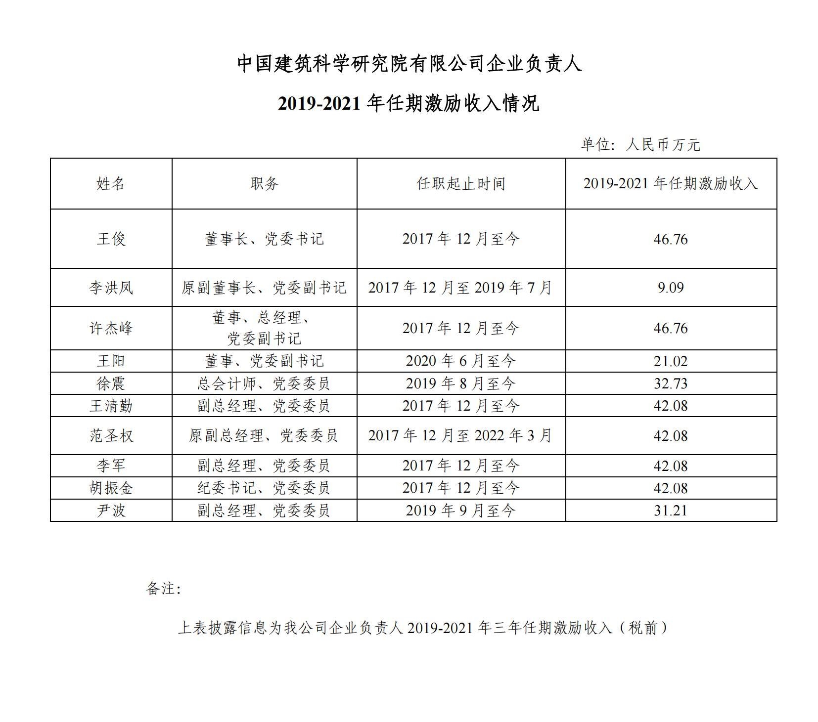 【企业负责人薪酬】中国建筑科学研究院有限公司企业负责人2019-2021年任期激励收入情况
